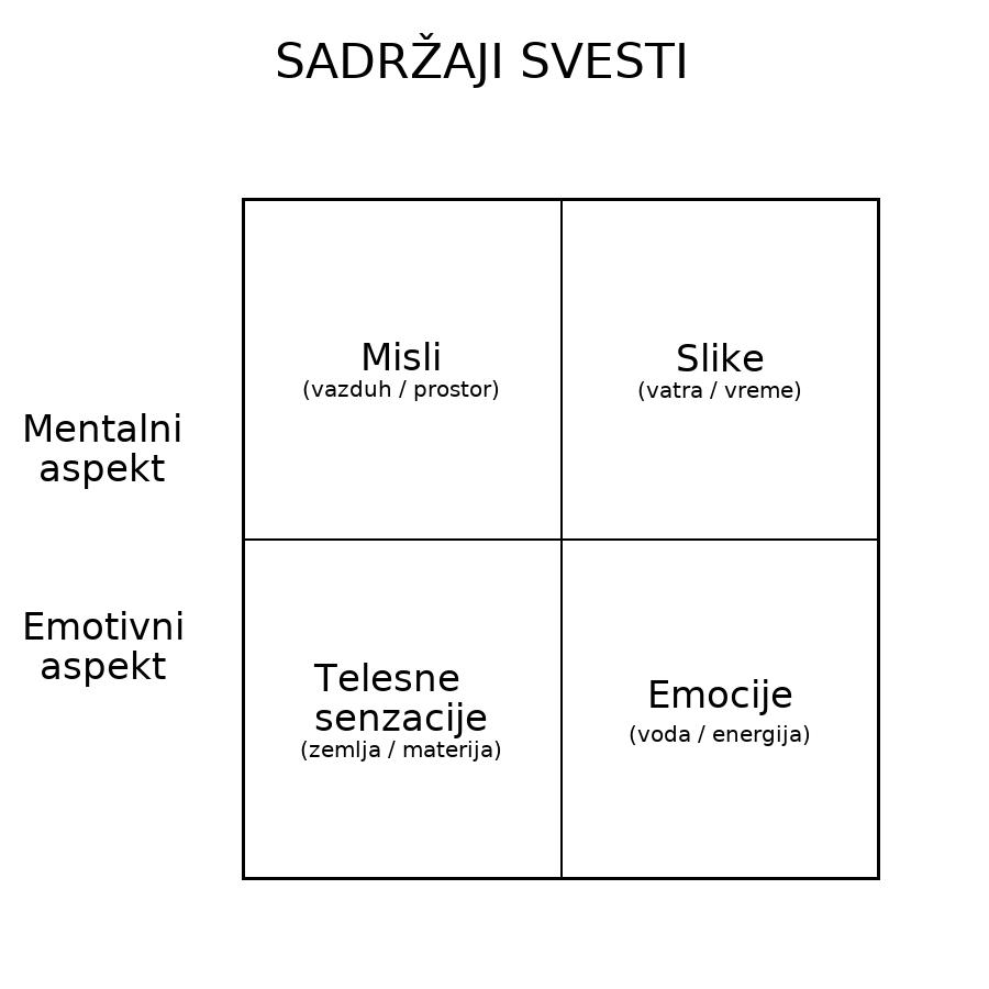 Ako bismo sada mogli da otvorimo i razgledamo šta se sve nalazi unutar naše svesti, naišli bismo – vrlo verovatno – na haos. Ali ako bismo pokušali da uvedemo red u taj haos, primetili bismo da se sve što se pojavljuje u našoj svesti može svesti na četiri osnovna oblika: